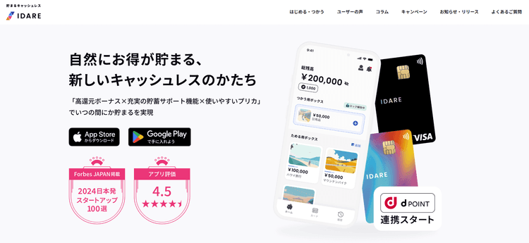 IDAREは入金するだけで残高に年率2%ボーナスが貯まる高還元ボーナスや、「目標額を決めて貯める」や「目標額は決めず貯める」など貯蓄しやすいサポート機能、IDAREユーザー同士で送金できる機能なども充実しています。